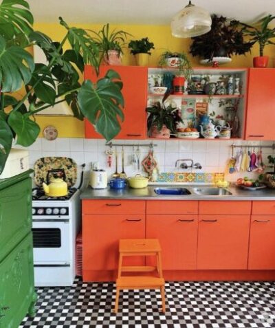 I absolutely live for bringing my personality to each room in a home. Why? Because there are so many sides to it. Some days I may feel red hot and want to be in a lively bright setting– but when I’m cooking I typically find that I prefer a lively environment, as you can see in old kitchen below: